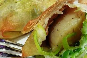 Déposez au centre de cette feuille de brick, 1 c à s de fondue de poireaux, puis posez dessus, une noix de St-Jacques crue avant de la recouvrir de 1 à 2 magrets (coupés en 3 morceaux pour faciliter la dégustation). Donnez un tour de moulin à poivre dessus.