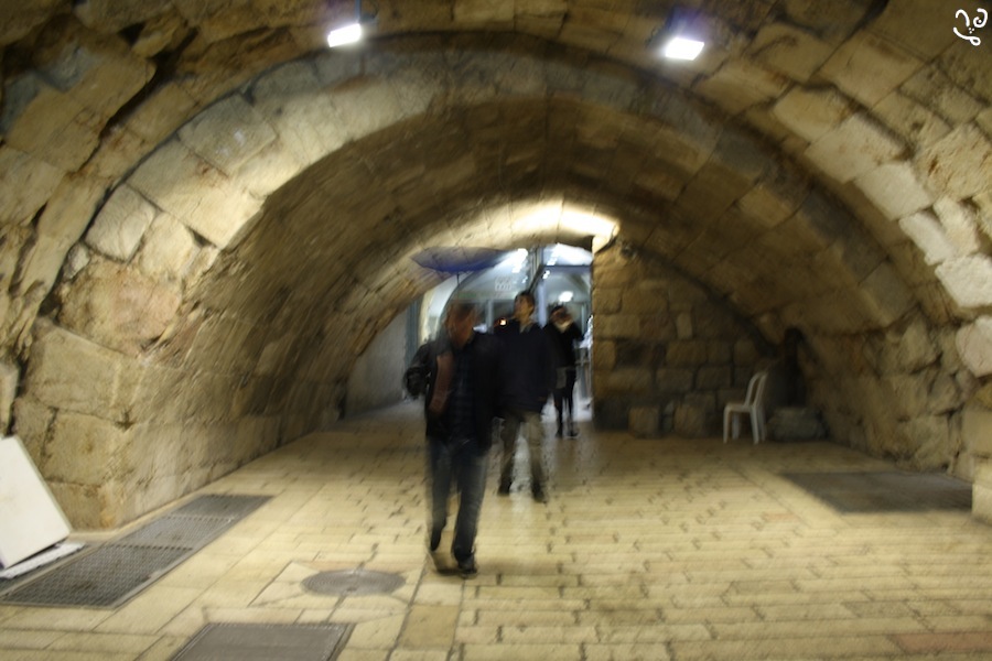 Bourrasques de vent. Les dernières hésitations entre un bref passage au couvent de l'Ecce Omo et un retour prématuré à la maison s'envolent. Un homme nous dépasse, Juif, ultra-orthodoxe, son chapeau noir affublé d'un sac en plastique pour le protéger des caprices de l'hiver hiérosolymitain. Lancés à sa suite, d'un pas rapide nous traversons le quartier musulman vers le mur des lamentations. Le portique de sécurité sonne, dans l'indifférence des gardes à son entrée... Quelques irréductibles trempés prient contre les pierres millénaires, surplombés par l'esplanade des mosquées.
