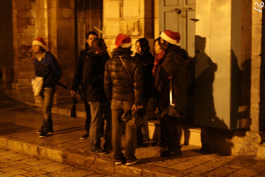 Mais aucune âme qui vive. Nos pas résonnent entre les flaques d'eau, sur les dalles rendues glissantes par la pluie. Une fois débouchés dans le quartier musulman, à quelques centaines de mètres de la Porte des Lions, nous tombons sur un prêtre orthodoxe très étonné de sa rencontre. "Tout la procession est partie à Bethlehem! Il n'y a rien ici jusqu'à demain matin..." explique-t-il en Russe à Yana dont le parapluie bleu se retourne brutalement, déclenchant l'hilarité générale. Quelques soldats intrigués à leur tour par notre présence confirment ses dires. Noël à Jérusalem n'existe pas. L'an prochain à Bethlehem? L'accès à la ville est interdit aux citoyens israéliens. Bredouilles, donc.