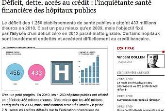 Forcément, alors que l’hôpital public (l’AP-HP en tête) communiquait sur les vertus du recours aux marché pour son développement, est venu maintenant le temps du réveil, avec une légère gueule de bois : Un endettement 24 milliards d’euros, contre « seulement » 10 milliards d’euros en 2005. Les plans Hôpital 2007 et Hôpital 2012 n’ont donc vraisemblablement pas été à la hauteur des enjeux en la matière, à moins que la messe -- contre toute apparence -- n’était déjà dite quelque part, quoi de mieux qu’une situation difficile pour justifier certains sacrifices? Non j’exagère.
