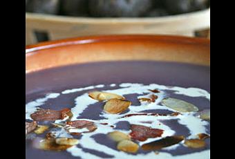 Il existe une multitude de variétés de pommes de terre et parmi elle, la vitelotte, cette pomme de terre à la chair violette et à la peau noire, on l'appelle également la "Truffe de Chine". J'aime beaucoup cette variété, elle apporte de la couleur dans les assiettes et est parfaite pour la présentation, mais elle a aussi ce petit goût de châtaigne qui fait d'elle ma préférence. On la consomme souvent en chips ou en purée, mais aujourd'hui, je vous propose un velouté, bien onctueux et très savoureux. Vous allez en étonner plus d'un avec cette soupe violette, elle est aussi belle que bonne et puis après les repas gargantuesques de noël, rien de tel qu'une bonne petite soupe.
