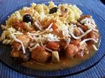 Peler et couper les champignons en 4. Peler et épépiner les tomates coupées en 4. Dans une cocotte (en fonte de préférence), mettre à chauffer 3 c. à s. prelevées directement dans le pot contenant les tomates confites. Ajouter les morceaux de tomates confites et les morceaux de dinde. Faire revenir la dinde de tous côtés. Ajouter une c. à s. de farine en remuant. Verser les morceaux de tomates, l’origan et l’eau dans la casserole. Saler et poivrer. Porter à ébullition. Couvrir et laisser mijoter 30min. Ajouter les champignons et les olives. Poursuivre la cuisson 10min. Servir chaud en accompagnement de pâtes ou de riz.