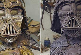 Réalisé par un artiste français nommé Alain Bellino, voici le buste de Dark Vador réalisé à partir de vieux couverts et autres ornements en laiton et en bronze. Comme vous pourrez les voir dans les images qui suivent, les yeux de l’empereur Sith ont été fabriqués à partir de deux cuillères ternies. Le recyclage a du bon !