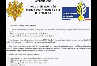 De nombreux internautes ont pu avoir la surprise de voir un message venant soit disant de la gendarmerie nationale et demandant 200 € pour débloquer l'ordinateur. Ce virus exploite une faille présente sur leur ordinateur, notamment dans les versions de Java de Windows XP et Windows Vista.