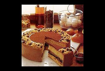 - Découper le gâteau en 2 dans l'épaisseur. Étaler une couche de crème sur une moitié ; déposer quelques cerneaux de noix et quelques raisins;. Reconstituer le gâteau. Couvrir de crème. Saupoudrer de cacao et décorer des cerneaux et du cacao restant.