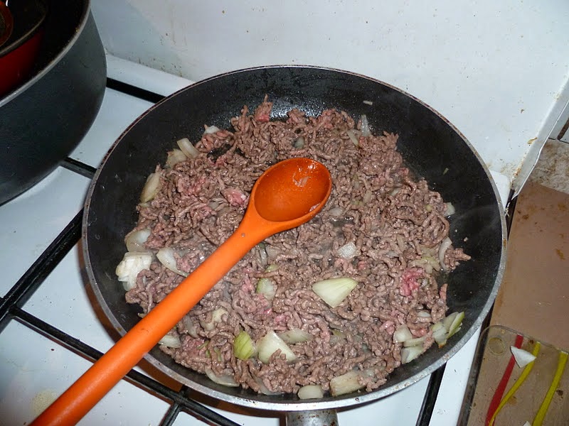 - dans une poêle faire revenir l'oignon haché avec la viande, ajouter les tomates pelées (sans le jus) en les écrasant bien auparavant