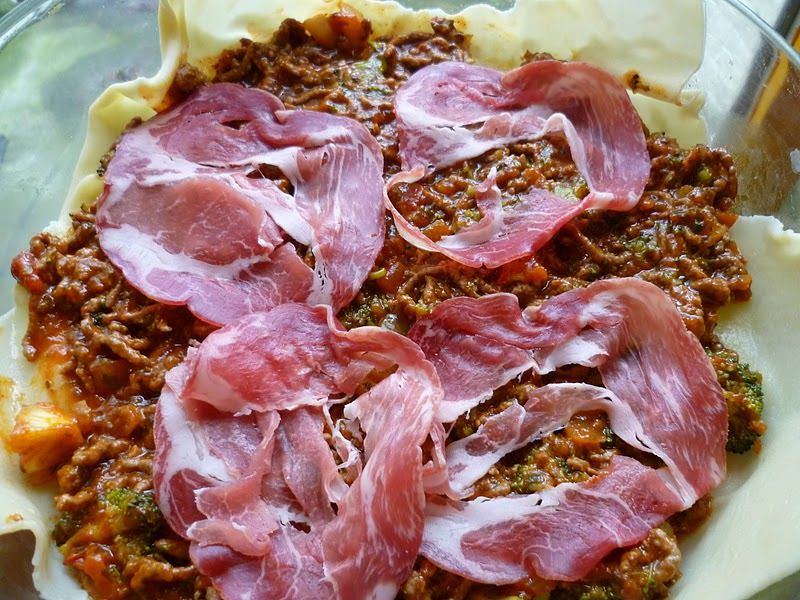 - disposer une nouvelle couche de feuilles de lasagne puis le reste du mélange à la viande ainsi que les 4 tranches de coppa