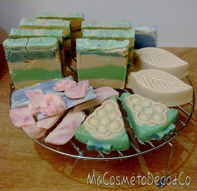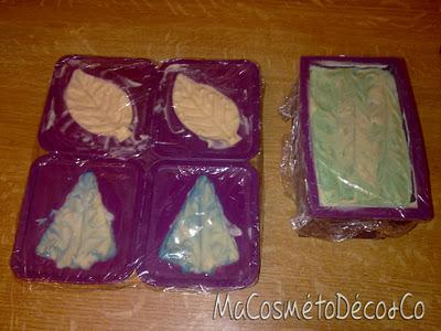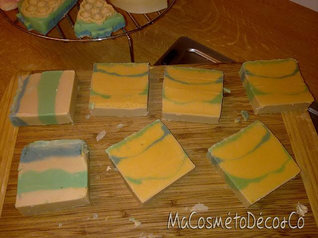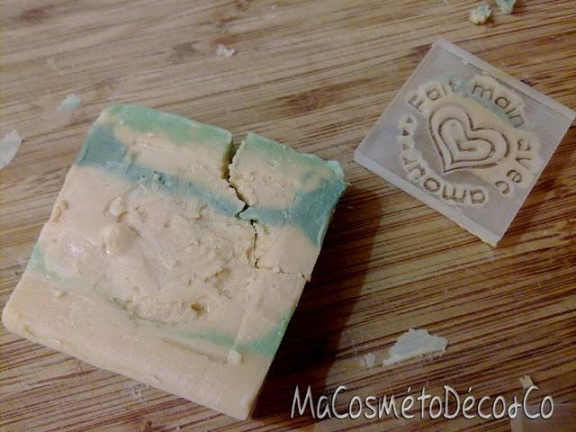 Par contre je suis très déçue des tampons que j'ai achetés chez Aroma Zone, je les ai pourtant utilisés dès démoulage, pour que les savons soient suffisamment mous mais même en faisant attention en appuyant, ça m'a cassé deux tranches, dont voilà la pire :