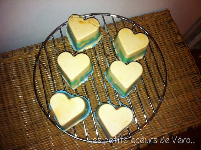 Et voilà une des photos des petits coeurs que m'a envoyée Véro, une fois démoulés à son retour chez elle en Belgique... Vous voyez, je ne comprends d'où ça vient ces savons qui transpirent...
