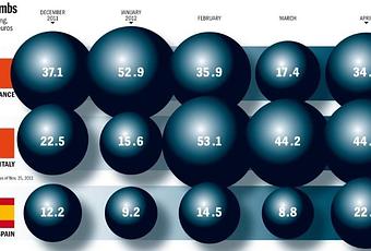 D’après un sondage disponible un temps sur le site de 24Heures, la crise de la dette publique semble avoir été l’événement le plus marquant de l’actualité économique de 2011 auprès du panel des personnes interrogées. Les choses ne sont pas près de changer en 2012, tel l’illustre ce mignon graphique du Spiegel représentant les dettes arrivant à maturation comme autant de bombes à retardement: