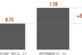 Sous forme graphique, les chiffres donnent les figures suivantes. Dans la première, vous trouverez une comparaison entre les téléchargements d’application sur la dernière de décembre (à droite) comparée à une moyenne hebdomadaire sur les deux premières semaines de décembre (à gauche) et on remarque un accroissement de plus de 60% d’applications téléchargées par semaine.