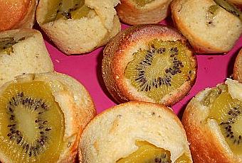 Couper 2 kiwis en dés et les ajouter à la pâte, mélanger. Couper des rondelles de kiwis avec le reste et les poser au fond des moules, recouvrir de pâte et cuire 18 min. Laisser refroidir et déguster, bon appétit !