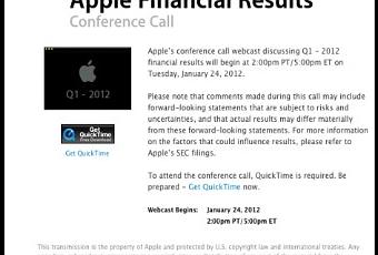 Apple vient d'annoncer que le 24 janvier sera tenue l'habituelle Conférence financière qui illustera les résultats du premier trimestre de 2012 et/ou des trois derniers trimestres 2011.