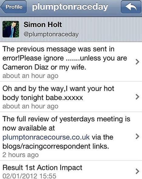 professionnel. Le message "Ah, au fait, je veux ton corps ce soir, bébé xxxxx", initialement adressé à sa femme, a ainsi été reçu puis retweeté par des centaines d'amateurs de turf.
