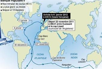 Tout d'abord le trophée Jules Verne, c'est un tour du monde à la voile, en équipage, et sans escale.