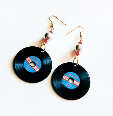 Boucles d'oreilles "vinyles disco" composées de vinyles vintage en plastique et perles en cristal Swarovski (y compris la perle ronde). Crochets d'oreilles en laiton doré. Longueur totale: 8 cm. Diamètre des vinyles: 3,8 cm