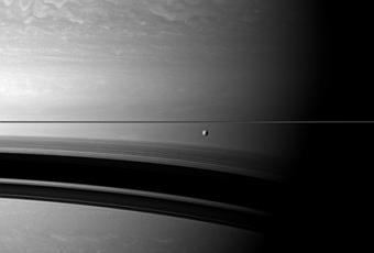 Cette photographie de Saturne a été prise par la sonde Cassini en décembre. Ses anneaux sont à l'horizontale (la ligne grise très fine au milieu). Les grandes traces sombres sur la planètes sont les ombres de ces anneaux. Le tout petit machin rond que vous voyez devant saturne, c'est Thétys, une de ses lunes, dont le diamètre fait un peu plus de 1000 kilomètres. Et oui, Saturne est une grosse mémère gazeuse.