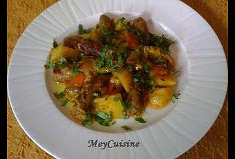 Portions : 4Préparation : 15 minCuisson : 35 minIngrédients : 750 g de merguez douces250 g de pommes de terre2 oignons1 poivron vert1 poivron rouge 3 gousses d’ail2 c à s d’huile d’olive 3 c à s de coriandre fraiche hachée1 c à c de curcuma moulue1 c à c de coriandre séchée1 c à c de cumin frais moulu 150 ml de bouillon de légumes ou l’équivalent en eau Sauce piquante (facultatif)Sel et poivre