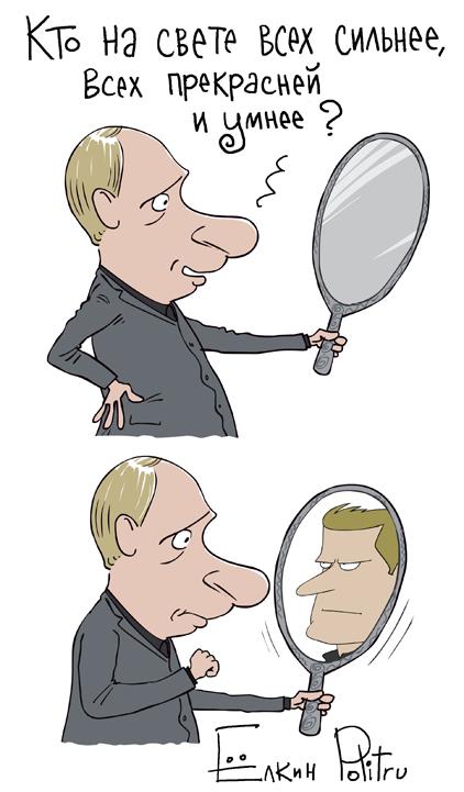 Dans ce dessin de Sergueï Elkine, Poutine demande à son miroir : "Miroir, mon beau miroir (cette phrase, Poutine ne l'a dit pas, mais perso, je trouve que c'est mieux avec), qui est sur la terre le plus fort, le plus beau et le plus intelligent ?" Et comme la méchante reine de Blanche-Neige, il est bien déçu par la réponse du miroir, qui lui montre... Alexeï Navalny, que je n'ai plus besoin de présenter.