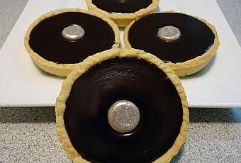 Des croûtes en pâte sablée, pour des tartelettes "bijou noir" qui sont remplies d'une ganache toute simple au chocolat noir 65% avec pour seule décoration un petit bouton en chocolat brossé d'une poudre irisée.Un look moderne et chic pour un dessert simple mais délicieux.