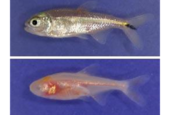 Avant de se glisser dans les tréfonds du département d’enseignement de biologie animale, nous faisons découvrir les vitrines qui sont déjà mises en place. Parmi elles, une de mes préférées montre deux aquariums juxtaposés avec deux populations d’Astyanax mexicanus, une espèce de poisson chez qui deux populations sont probablement en train de se scinder en deux espèces: un phénomène appelé spéciation. En effet, une population est retrouvée en surface et arbore les caractéristiques classiques de la poiscaille: yeux ahuris, écailles pigmentées aux reflets argentés, etc. tandis que l’autre se retrouve dans des grottes sous-marines et à l’abri de la lumière depuis 1 million d’années. Le contraste morphologique est saisissant: