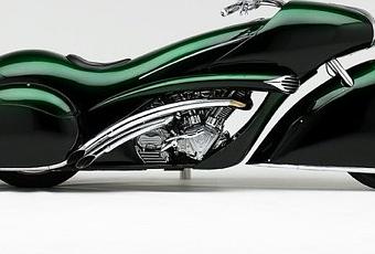 Vous vous souvenez peut-être de la mémorable Rhinebeck de Ray Courtney, construite en 1936 et aujourd’hui devenue icône du rétro-futurisme. Je vous présente aujourd’hui Smoothness de Arlen Ness, une moto qui pourrait être une relecture design et contemporaine de la Rhinebeck. Le côté rétro-futuriste est toujours présent, le chrome aussi, mais les courbes sont plus arrondies et le noir a laissé place à un vert profond. Du très beau tuning.
