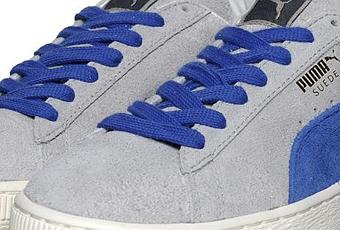 Les Puma Suede VNTG Grey Violet-Puma Royal arborent un dessus en daim premium gris contrasté par des accents de bleu et par une semelle blanche.