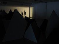 Si comme Ellsworth Kelly , dans un musée vous préférez regarder les volumes ou par les fenêtres, si vous aimez flâner, expérimenter, alors la déambulation/promenade conçue par Dominique Gonzales Foerster est pour vous. Nous sommes invités à la flânerie plus qu'à une exposition. Ici l'espace de l'escalier accueille de curieux transats et nous donne à voir un mur que nous ne regardons jamais d'habitude mais qui devient un écran pour la vidéo de Nicolas Gesquières. La fée Electricité est habitée de l'espace sonore crée par Bashung. Puis on redescend vers une jetée posée dans une pénombre et on marche jusqu'à attendre pour rentrer dans le "Cosmodrome" via une passerelle extérieure (là encore jamais soupçonnée en temps habituel). Et là c'est d'abord le noir total puis quelques lumières sur des pianotements électroniques (par Jay Jay Johanson), des tâches colorées et un rayon jaune apparaissent ... les planètes !
