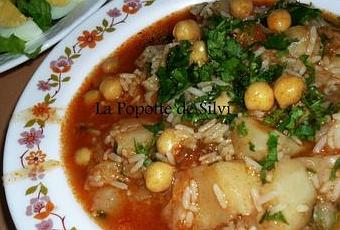avant la fin de cuisson ajouter la poignée de riz et laisser cuire , une fois que tout est cuit parsemer de coriandre ciselé