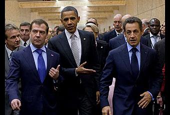 -De gauche à droite : Dimitri Medvedev, Barack Obama et Nicolas Sarkozy-