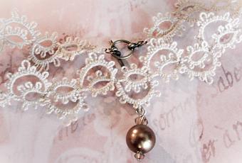 Je continue dans la collection romantique, voici la Marquise, tour de cou délicat entièrement tissé à la main, orné d’une perle de verre et de cristaux de Swarovski.