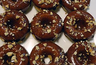 Ici, j'ai simplement cuit un biscuit éponge dans des moules en anneaux et les ai trempés dans une ganache au chocolat au lait. Une garniture d'amandes grillées hachées vient terminer le tout.