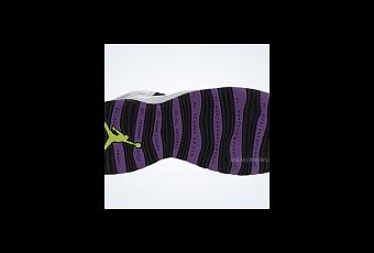 La paire revêt un dessus en cuir verni blanc et mesh noir contrastés par des accents de violet et de vert.