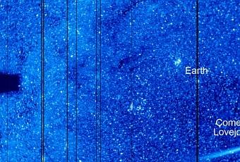 L’intrépide comète Lovejoy - de son vrai nom comète C/2011 W3 Lovejoy - qui a « défrayé la chronique » en décembre 2011 pour avoir frôler de très près notre étoile et ensuite s’exhiber à l’aube dans l’hémisphère sud pour le plus grand plaisir des photographes (voir ici), apparait ici dans le champ du coronographe de la sonde spatiale Stereo A (Stereo A et B sont de part et d’autres du Soleil et en livre ainsi une vision 3 D) tandis qu’elle s’enfonce dans le système solaire. Le Soleil est hors champ (à droite de l’image) mais la longue chevelure de la minuscule comète (la taille du noyau est estimée à environ 200 mètres), soumise à l’impétueux vent solaire, indique clairement sa direction. A l’arrière plan, on distingue le nuage délicat et potelé de la Voie Lactée, les étoiles des constellations d’Orion (en bas), le V de la gueule du Taureau et aussi la belle grappe des Pléiades qui, du point de vue de Stereo, est en conjonction avec … la Terre !