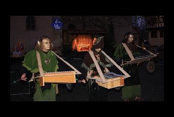Mais ce sont aussi des musiciens. Ils jouent de la flûte, du xylophone et des percussions à la grande joie des enfants impressionnés, amassés devant eux. Ils communiquent comme cela, car ils ne parlent qu’une sorte dialecte scandinave ; du danois dit-on. Après leur passage au village ils ont laissé la place à l’ « Allumeur de réverbères » et ses petits porteurs de lumière sont arrivés. Ils allumèrent la dernière bougie de la couronne de l’avant puis sont allés ouvrir la fenêtre numéro 17 du calendrier de l’avant géant.