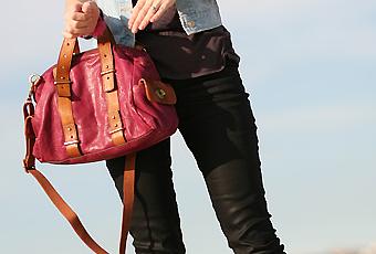 Pantalon slim coton enduit (plus dispo, mais je conseille ce modèle ou encore celui-ci) et t-shirt Somewhere – veste en jean à clous – sac en cuir Fossil (rayon maroquinerie) – bottines lacées The Kooples