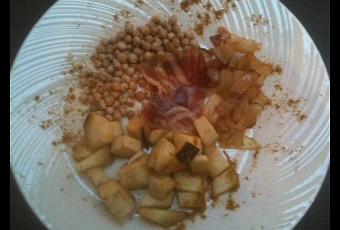 J’ai eu donc le temps de faire l’état des lieux du frigo et des placards et j’ai eu envie de préparer pour cette assiette : des pois chiches, des aubergines, des oignons et du jambon espagnol, avec une touche de curcuma et un peu d’huile d’olives. Simple, sain et savoureux.