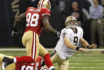 Après un punt de San Francisco (grâce à deux stupides échapées de Michael Crabtree), New Orleans entre en mode two-minute drill et Brees tente une bombe à Devery Henderson. INTERCEPTÉ! Tarell Brown fait un splendide catch en sautant et les Niners reprennent le ballon avec 1:49 à faire… mais ne font rien.