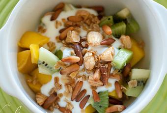 Pour servir, déposer les dés de fruits dans un bol, et verser le citron vert, le yahourt et deux belles cuillères à café de granola.