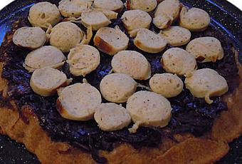 Évaluation de la recette :Une Tatin délicieuse & bien équilibrée malgré une association d'ingrédients riches en graisses (boudin blanc) & en sucre (confiture d'oignons).La confiture d'oignons sucrée à point, le boudin blanc en tranches assez fines subliment le palais.