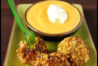 Le velouté est une ancienne recette de mon blog, testée et retestée et que tout le monde adore à la maison , auquel j'ai rajouté ces petites croquettes de poulet très fun !