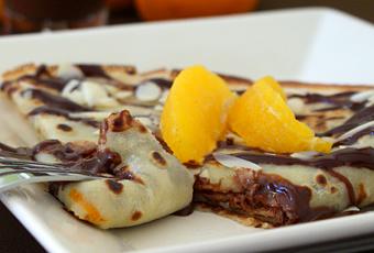 2. Repliez la crêpe en quatre, puis servez-la avec quelques amandes effilées parsemées sur le dessus, un filet supplémentaire de ganache au chocolat si vous êtes de vrais gourmands, et des suprêmes d’orange fraîchement prélevés.