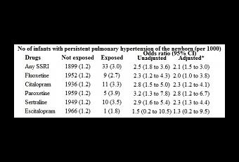Source: British Medical Journal 2012;344:d8012 « Selective serotonin-reuptake inhibitors during pregnancy and risks of persistent pulmonary hypertension of the newborn: population based cohort study from the five Nordic countries”