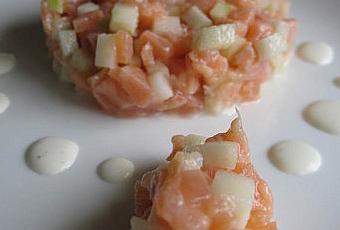 Détailler finement le saumon frais et le saumon fumé. Tailler la pomme granny en petits cubes. Prélever les zestes du citron vert. Presser le citron vert et un demi citron. Mélanger les jus de citrons avec le tartare de saumon et la pomme.