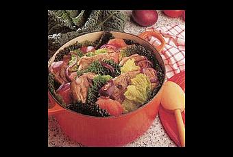 - Ajouter les feuilles de chou et les tomates dans la cocotte. Saler, poivrer, puis verser le bouillon. Couvrir et cuire à feu très doux pendant 3 h.