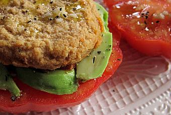 Version plus légère pour le burger au poivron...Recette pour 4 à 6 portions :8 oz de noix de macadamia trempées une nuit2 poivrons rouges1 petit chou fleur1/2 oignon2 cuillères à thé de miso blancMettre tous les ingrédients dans le mélangeur, les poivrons vont rendre assez d'eau pour ne pas avoir besoin d'en ajouter. Une fois le mélange obtenu, répartir sur les plateaux de séchage.Déshydrater 12 heures et retourner à deux tiers du temps environ.