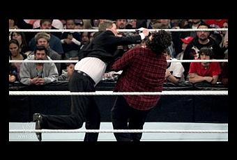 Brandissant le poing Punk fait mine de frapper John Laurinaitis qui bat en retraite.