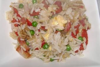 3) Faire dorer les lardons dans un wok. Ajouter les poivrons coupés en lanières, les petits, pois, le riz, les morceaux d'omelette et la sauce soja. Poivrer et saler légèrement (la sauce soja et les lardons le sont déja)