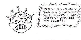 "Freddy, je t'ai déjà dit d'enlever tes gants quand tu me presses les points noirs !"