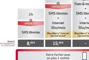 - 57,99€/mois : appels illimités + SMS illimités + Internet 24H/24 (3Go/ mois) + « very smartphone » (ex : Samsung Galaxy S2 à 1€, iPhone 4S 16Go à 199€) – Engagement 24 mois